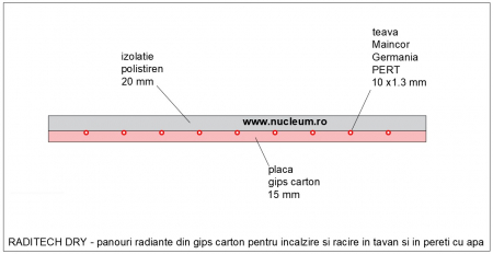 In placa de gips carton este incastrata teava MAINCOR PERT 10x1.3 la pas de montaj de 50 mm sub forma de melc. La partea superioara este lipita izolatie din polistiren EPS100 de 20 mm grosime.