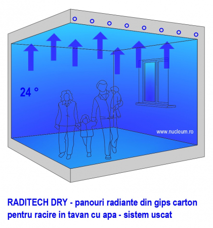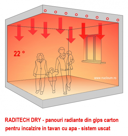 Sistemul de pereti si tavane radiante din gips carton reprezinta o solutie moderna atat pentru incalzirea cat si pentru racirea unei cladiri, este compus din panouri din gips carton in care sunt incorporate tevi din material plastic cu diametrul de 10 mm prin care circula apa calda sau apa rece. Pot fi utilizate impreuna cu o gama larga de surse de energie cu energie electrica, gaze naturale, GPL, comustibili lichizi, peleti, biomasa, inclusiv surse regenerabile, cum ar fi panourile solare sau pompele de caldura.