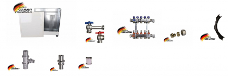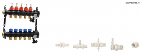 · cutie distribuitor · distribuitor cu debitmetre · robineti 1" · piesa cuplare teava la distribuitor 16-3/4" EK · curbe conducatoare 10 si 16 · teuri reduse 16-10-16 · nipluri reduse 16-10 · mansoane alunecatoare 10 si 16 · teava PERT 10 mm · teava PERT-AL-PERT 16 mm · izolatie din cauciuc elastomeric cu grosime de minim 9 mm pentru varianta de incalzire si racire · izolatie din PE cu grosime de minim 9 mm pentru varianta de incalzire